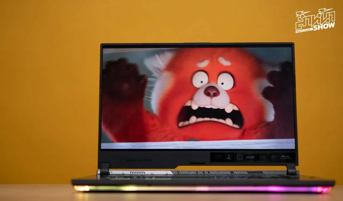 ด้านล่างของตัวเครื่องมี Surrounded Light Bar ซึ่งเป็นไฟ RGB เป็นเส้นแนวยาวโอบล้อมตัวเครื่องด้านหน้า เรียกได้ว่าสวยงามลงตัวสุดๆ เหมาะสมกับการเป็นเกมมิ่งแล็ปท็อปในซีรีส์ Strix Scar มากๆ เลยล่ะ! โดยที่ไฟเส้นนี้ก็จะส่องลงพื้นและสะท้อน ช่วยเพิ่มบรรยากาศให้กับห้องของเราได้เป็นอย่างดีเลยครับ