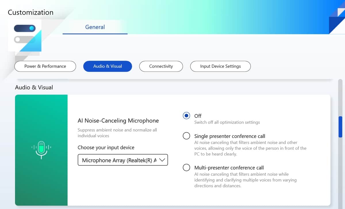 สำหรับการใช้งานประชุมออนไลน์ ที่ด้านข้างของกล้องเว็บแคม จะมีไมโครโฟนคู่ พร้อมระบบ AI noise-canceling ที่จะช่วยตัดเสียงรบกวนรอบข้างไ้ดอย่างชาญฉลาด ที่มีการเรียนรู้เชิงลึกของปัญญาประดิษฐ์ ช่วยตัดเสียงรบกวนทั้งเสียง Input และ Output ทำให้เสียงพูดของเราในระหว่างประชุมออนไลน์มีความชัดเจน โดยเลือกปรับได้ในโปรแกรม MyASUS