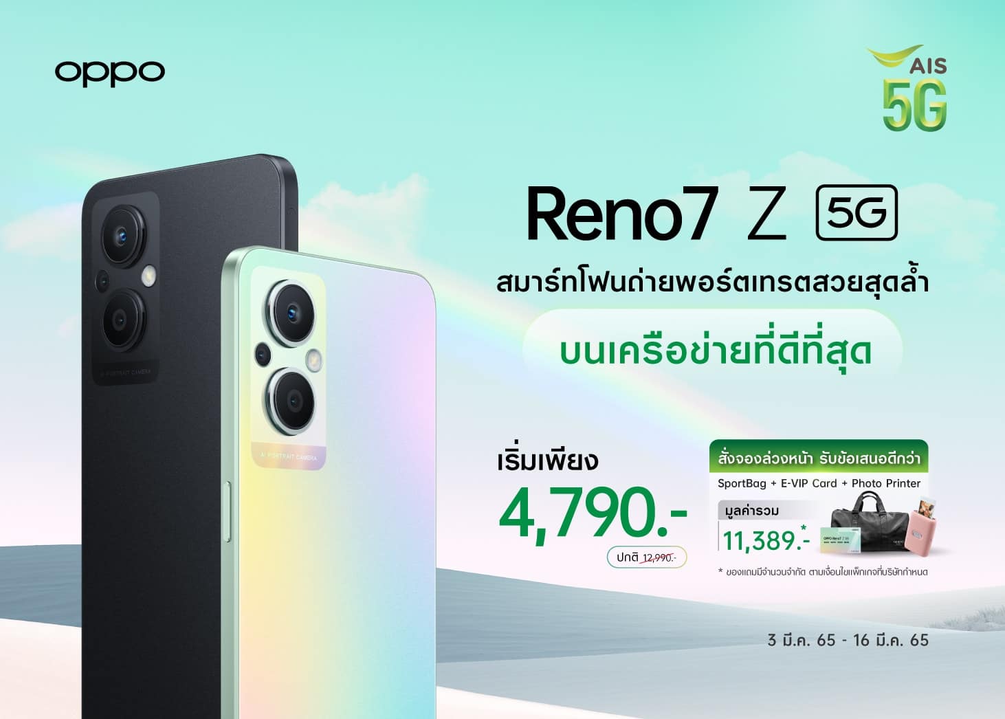 โปรโมชัน OPPO Reno7 Z 5G จาก 3 โอเปอเรเตอร์ AIS True และ dtac พร้อมข้อเสนอสุดพิเศษ ราคา เริ่มต้นเพียง 4,790 บาท ตั้งแต่วันนี้ – 16 มีนาคมนี้