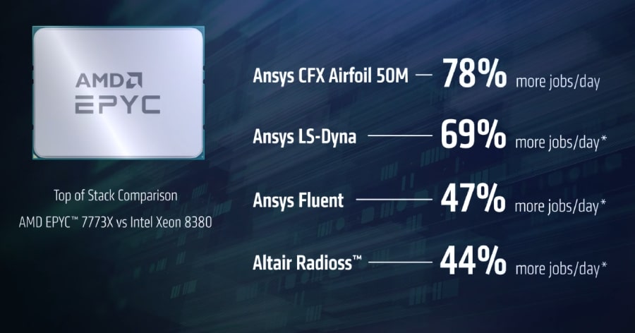 โปรเซสเซอร์ 3rd Gen AMD EPYCที่มาพร้อมด้วยเทคโนโลยี AMD 3D V-Cache เสนอผลลัพธ์ด้านการแสดงผลบนเวิร์คโหลดได้รวดเร็วยิ่งขึ้น เป็นเซิร์ฟเวอร์โปรเซสเซอร์ที่มีประสิทธิภาพสูงที่สุดในโลกสำหรับงานด้านการประมวลผลทางเทคนิค เช่น: