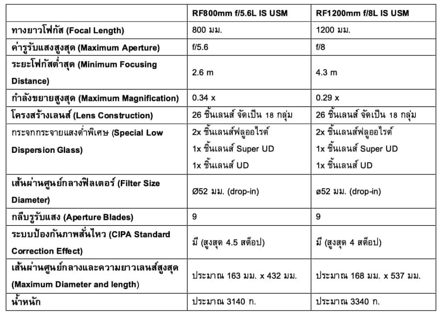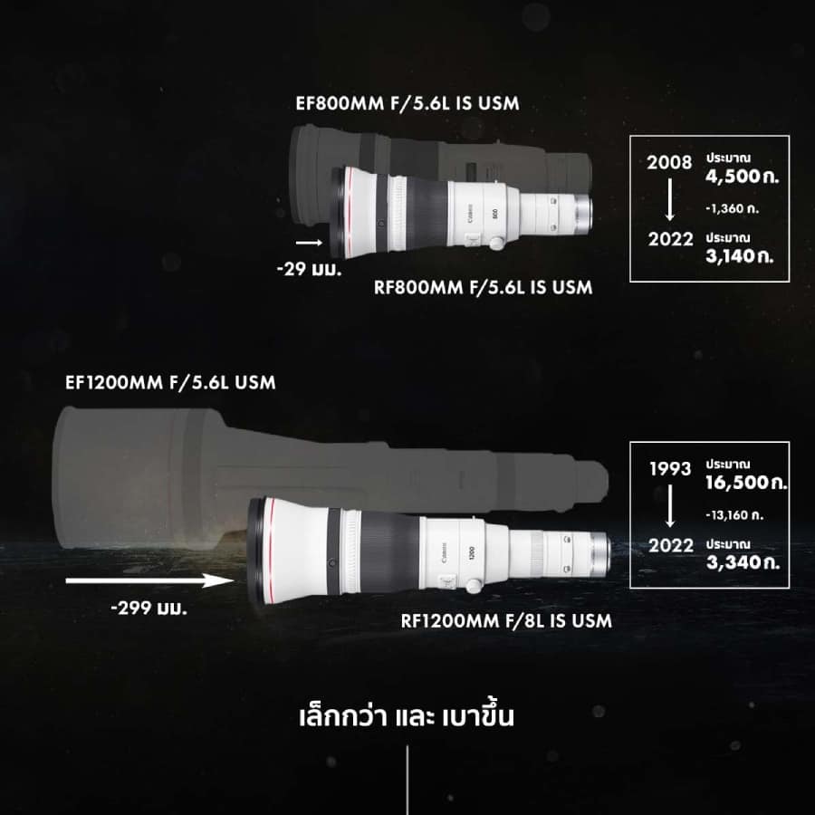 กลุ่มผลิตภัณฑ์เลนส์รุ่นใหม่ทั้ง RF800mm f/5.6L IS USM และ RF1200mm f/8L IS USM ต่างพัฒนาต่อยอดจากเทคโนโลยีล้ำสมัยที่เคยสร้างปรากฏการณ์ให้กับวงการกล้องถ่ายภาพของแคนนอน