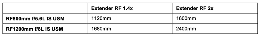 ทั้งเลนส์ RF800mm f/5.6L IS USM และ RF1200mm f/8L IS USM สามารถใช้ได้กับอุปกรณ์ขยายระยะเลนส์ Extender RF 1.4x และ Extender RF 2x โดยเมื่อติดตั้งอุปกรณ์ดังกล่าวแล้วจะมีทางยาวโฟกัสดังนี้