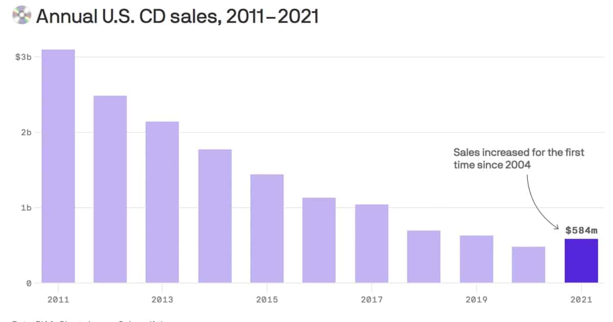อย่างที่เกริ่นไว้ตอนต้นว่ายอดขาย CD นั้นลดลงตั้งแต่ปี 2004 และลากยาวแบบนี้มา 17 ปี ดูทรงแล้วเห็นถึงแนวโน้มที่มันกำลังจะตายตามเทปคาสเซ็ทไป อย่างไรก็ตาม จากรายงานของสมาคมอุตสาหกรรมแผ่นเสียงแห่งอเมริกา หรือ RIAA ระบุว่าชาวอเมริกันซื้อ CD 46.6 ล้านแผ่นในปี 2021 มีอัตราการเติบโตขึ้นเกือบ 50% จากยอดการซื้อ CD ของปี 2020 ที่ทำได้ 31.6 ล้านแผ่น และรายได้จาก CD เพิ่มขึ้น 21% คิดเป็น 584 ล้านดอลลาร์