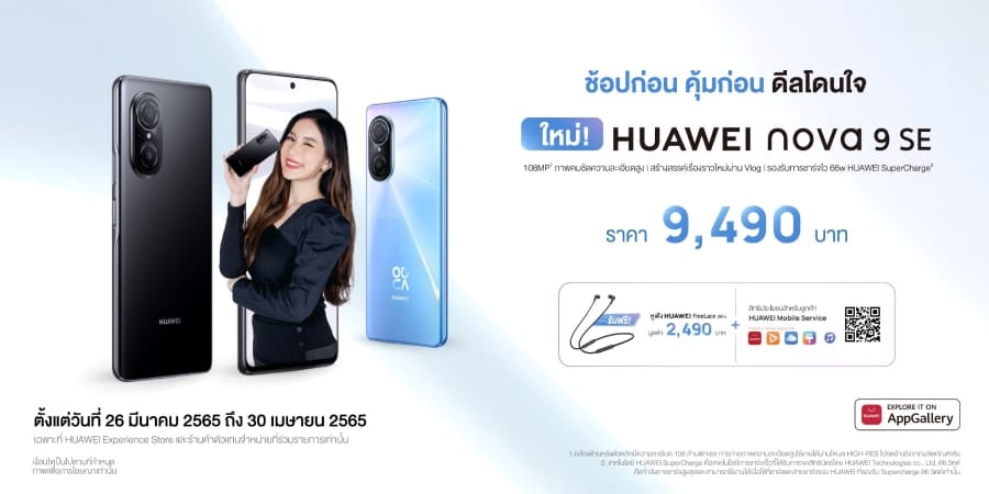 อย่ารอช้า สมาร์ทโฟนราคาดี กล้องเด่น สร้างคอนเทนต์ได้หลายมิติ และยังรองรับการชาร์จไว HUAWEI SuperCharge 66W มาพร้อมราคาสุดคุ้ม กับ HUAWEI nova 9 SE ราคาเพียง 9,490 บาท มีให้เลือก 2 สี คือ Crystal Blue และ Midnight Black เมื่อซื้อตั้งแต่วันที่ 26 มีนาคม 2565 ถึงวันที่ 30 เมษายน 2565