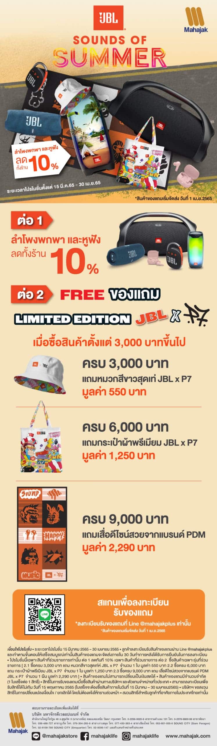 มหาจักรฯ จัดโปรรับซัมเมอร์ กับโปรโมชั่น Sound of Summer สินค้าลำโพง และหูฟัง ลด 10% ทั้งร้าน พร้อมรับของแถมสุด Limited Edition จาก JBL X P7 ระยะเวลาโปรโมชั่นตั้งแต่วันที่ 15 มีนาคม 2565 – 30 เมษายน 2565 นี้เท่านั้น