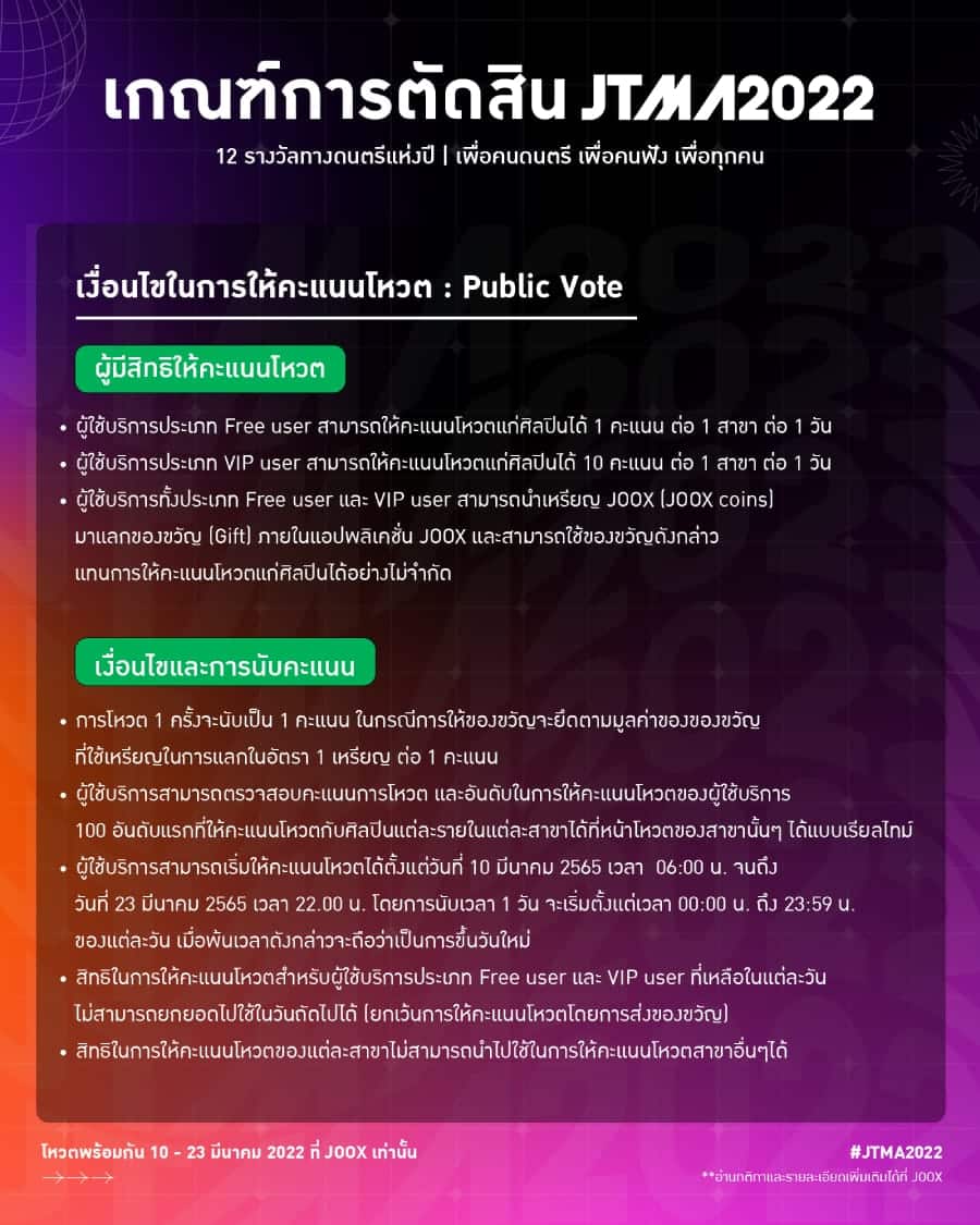 สามารถติดตามความคืบหน้าต่างๆ เกี่ยวกับงาน JTMA2022 ได้ผ่านโซเชียลมีเดียทุกช่องทางของ JOOX และสามารถดูรายละเอียดเพิ่มเติมและร่วมโหวตได้ที่ JOOX เท่านั้น คลิกเลย JTMA 2022