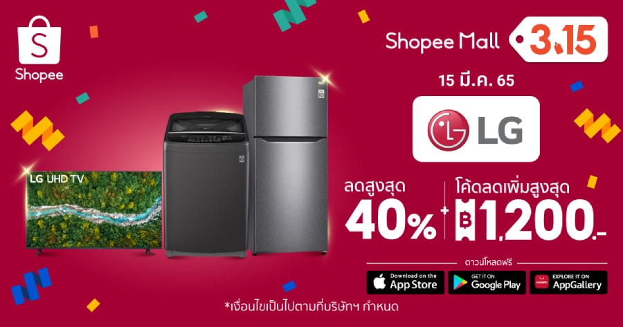 เพราะเราให้ของขวัญตัวเองได้ทุกวัน! แอลจี จัดทัพสินค้าไฮเทคฯ เสิร์ฟส่วนลดสูงสุด 40% และโค้ดส่วนลดเพิ่ม 1,200 บาท ในมหกรรม Shopee 3.15 Consumer Day