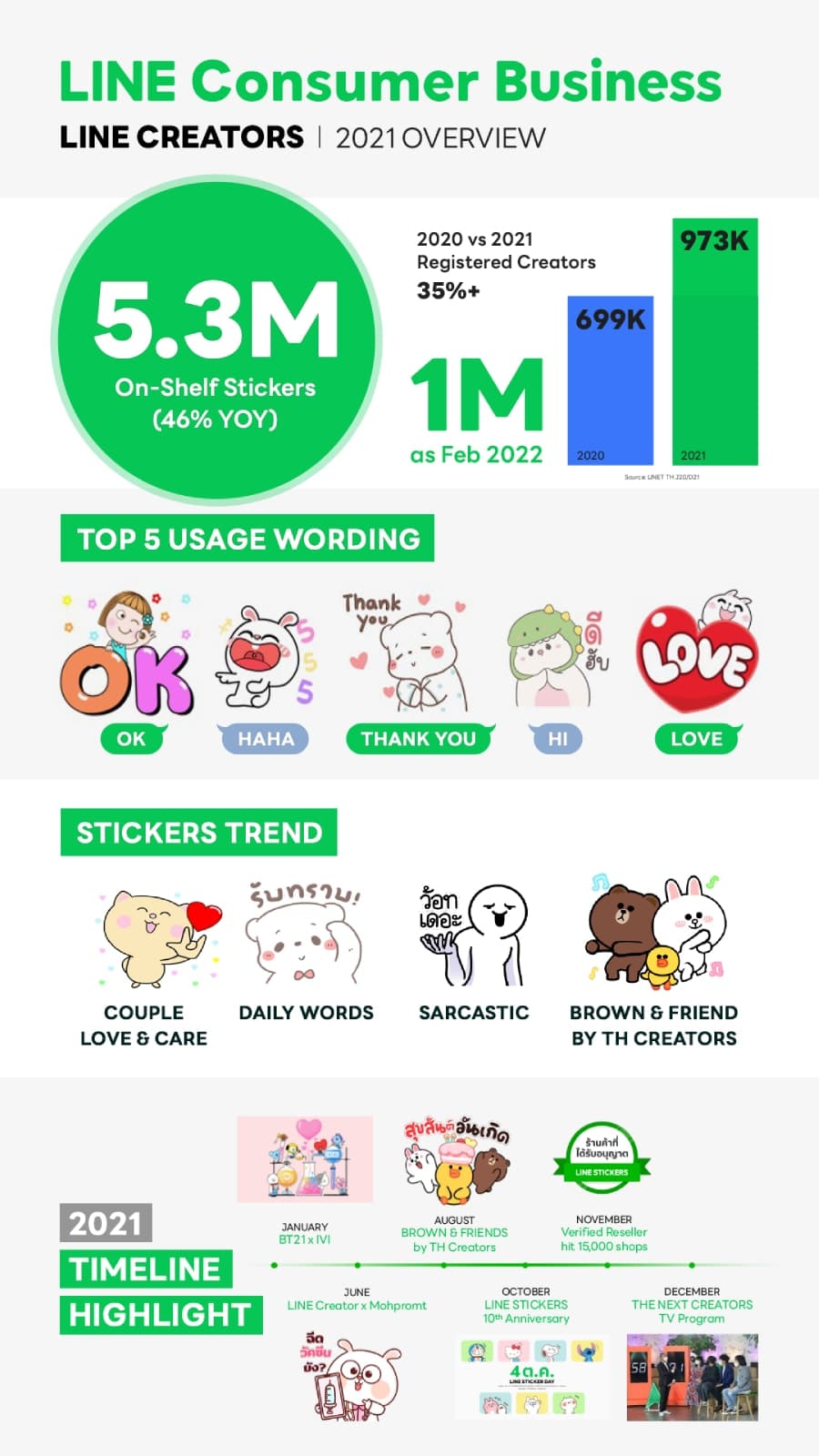 ที่ผ่านมา ภายใต้สถานการณ์ที่ท้าทาย ธุรกิจพาณิชย์ภายใต้ LINE Consumer Business ยังคงเติบโตได้อย่างแข็งแกร่ง โดยมีครีเอเตอร์ไทยผู้สร้างสรรค์สติกเกอร์ร่วมงานกับ LINE (LINE Creators) แล้วกว่า 1 ล้านราย และสติกเกอร์วางจำหน่าย
