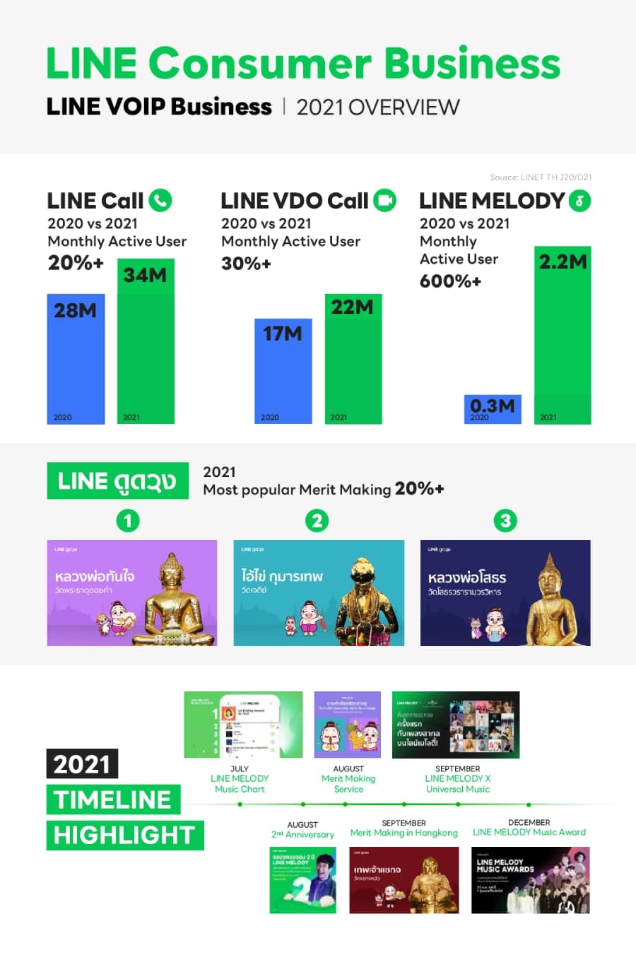 ด้าน LINE MELODY เสียงเรียกเข้าและเสียงรอสายเมื่อโทรผ่าน LINE Call ก็ได้รับความนิยมเพิ่มขึ้นอย่างรวดเร็วเช่นกัน โดยในปี 2564 มีผู้ใช้งาน LINE MOLODY ต่อเดือนกว่า 2.2 ล้านคน เพิ่มขึ้นจากเดือนมกราคมปี 2563 กว่า 600% โดยปัจจุบันมีคลังเพลงทั้งสิ้นกว่า 38,000 เพลงจากกว่า 43 พันธมิตรค่ายเพลงและ Music Distributors ทั้งไทยและต่างประเทศ โดยพันธมิตรรายล่าสุด Universal Music เสริมเพิ่มมาเมื่อกันยายน 2564