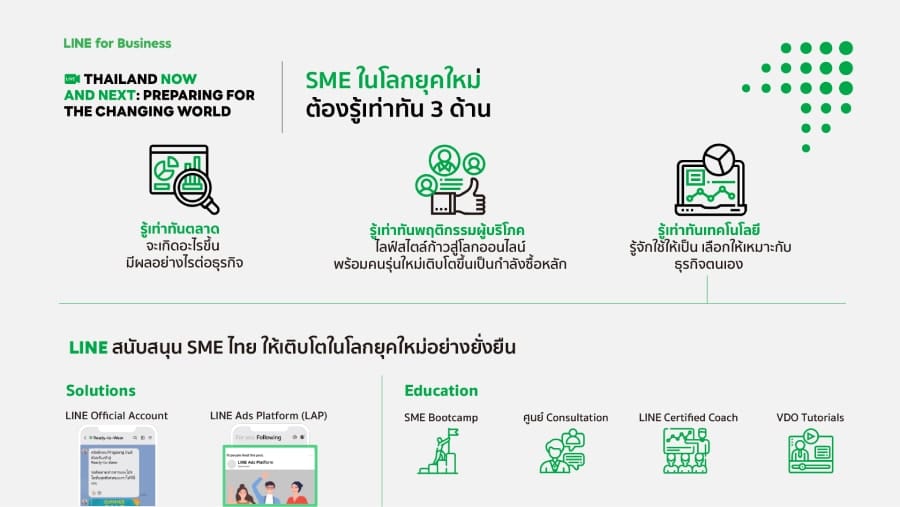 ไม่ว่าจะเป็น LINE Official Account ซึ่งปัจจุบันมีจำนวนการเปิดใช้งานกว่า 5 ล้านบัญชี ซึ่ง 90% ของบัญชีทั้งหมดนับเป็นธุรกิจ SMEs และโซลูชั่นด้านโฆษณาอย่าง LINE Ads Platform (LAP) ตลอดจนการส่งเสริมความรู้ด้านเทคโนโลยีกับ SME อย่างต่อเนื่อง เช่น กิจกรรม SME Bootcamp ที่มีทั้งในรูปแบบ LIVE และWebinar คอนเทนต์ Tutorial ต่างๆ ในรูปแบบวิดีโอให้ SME ไทยพร้อมเรียนรู้ได้ด้วยตนเอง ศูนย์ Consultation ให้คำปรึกษาถามตอบปัญหากับกูรูในเรื่อง LAP แบบเจาะลึก และ LINE Certified Coach กองทัพกูรูด้านดิจิทัลที่ได้รับการรับรองจาก LINE ช่วยเผยแพร่ความรู้ด้านเทคโนโลยีบน LINE ให้กับ SME ไทยทั่วประเทศตลอดปีนี้ เป็นต้น