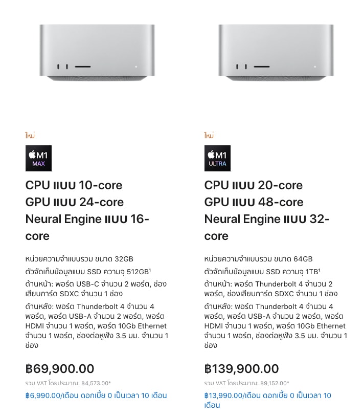 • Mac Studio รุ่นชิป M1 Max หน่วยความจำ 32GB SSD 512GB ราคา 69,900 บาท เริ่มส่งมอบสินค้าปลายเดือนมีนาคม
