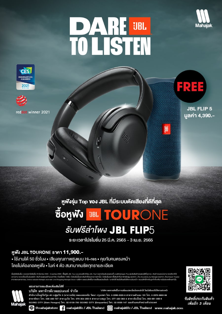 มหาจักรฯ จัดโปรโมชั่นพิเศษสำหรับหูฟัง Over-Ear ที่ตัดเสียงรบกวนได้ดีที่สุดของรุ่น เมื่อซื้อหูฟัง JBL TOUR ONE รับฟรี!! ลำโพง JBL FLIP 5 (มูลค่า 4,390 บาท)