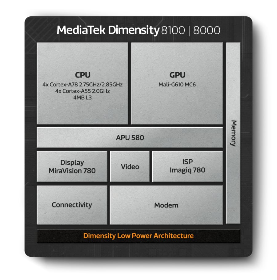 MediaTek ได้นำเทคโนโลยีขั้นสูงจากแพลตฟอร์มและแพ็คเกจของชิป Dimensity 9000 ระดับเรือธงอันทรงพลังใส่เข้าไปในชิปซีรีส์ Dimensity 8000 รุ่นใหม่ อีกทั้งยังผลิตด้วยกระบวนการผลิต 5nm TSMC ที่ประหยัดพลังงานได้ถึงขีดสุดที่มาพร้อมกับ CPU แบบ Octa Core