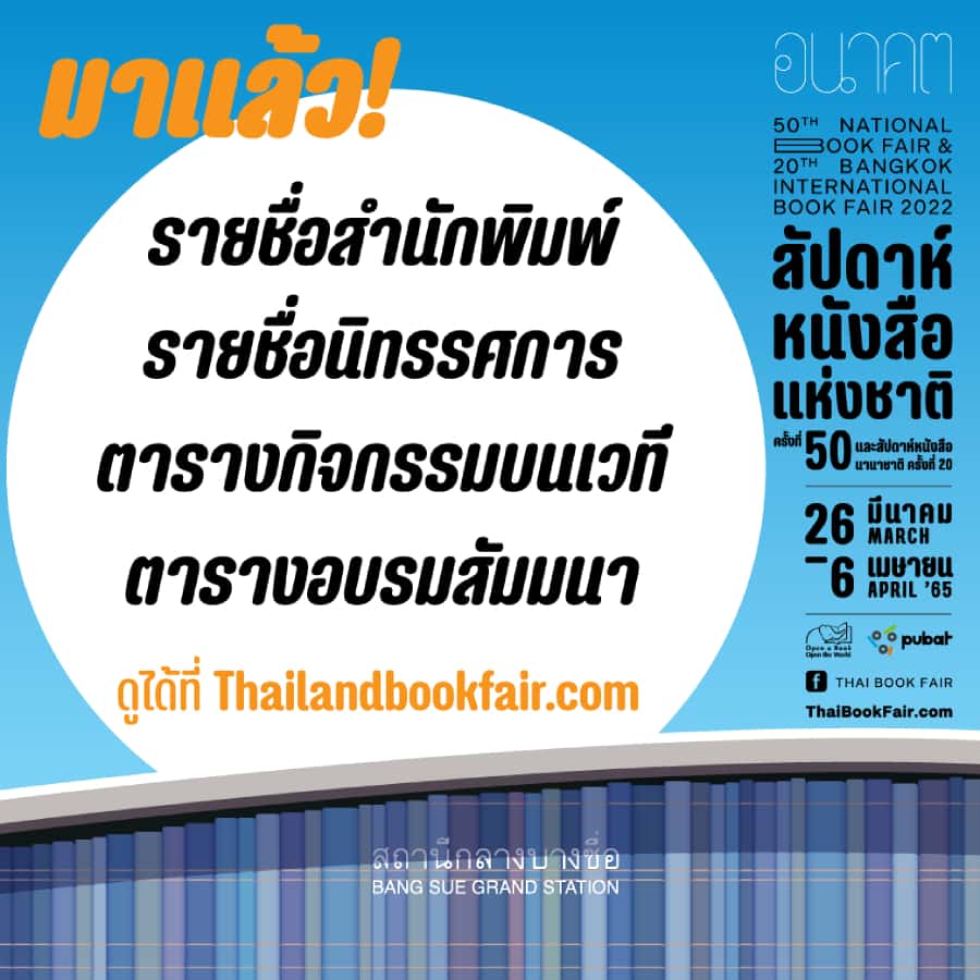 ไปอ่านอนาคตกันที่งาน สัปดาห์หนังสือแห่งชาติ ครั้งที่ 50 และสัปดาห์หนังสือนานาชาติ ครั้งที่ 20 ณ สถานีกลางบางซื่อ ระหว่างวันเสาร์ที่ 26 มีนาคม – วันพุธที่ 6 เมษายน 2565 เวลา 10.00 – 21.00 น. (วันเสาร์ที่ 26 มีนาคม เปิดให้เข้างานเวลา 17.00-21.00 น.) ติดตามรายละเอียดกิจกรรมต่างๆ ภายในงานได้ที่ Facebook https://www.facebook.com/bookthai หรือ Website https://thailandbookfair.com/