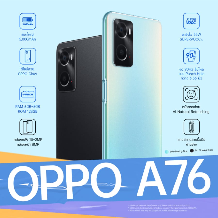 OPPO A76 สมาร์ทโฟนชาร์จไว แบตอึด จอไหลลื่น คุ้มค่าทุกการใช้งาน วางจำหน่ายในราคา 7,999 บาท มาพร้อม 2 สีให้เลือก ได้แก่ สีฟ้า Glowing Blue และ สีดำ Glowing Black ดีไซน์สวยด้วย OPPO Glow Design ที่ช่วยให้ทนต่อรอยนิ้วมือ รอยขีดข่วน มอบความสวยสะดุดตา น่าสัมผัส สามารถไปทดลองสัมผัสหรือเป็นเจ้าของได้แล้ววันนี้ ณ OPPO Brand Shop ทุกสาขา และตัวแทนจำหน่ายทั่วประเทศ