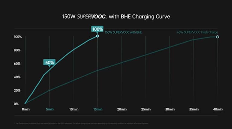 จากวิวัฒนาการเทคโนโลยี 125W SUPERVOOC flash charge ชั้นนำ มาสู่ 150W SUPERVOOC flash charge พร้อม BHE ที่ใช้เทคโนโลยีการชาร์จกระแสตรงพร้อมปั๊มชาร์จ 2 ตัว ซึ่งสามารถรองรับการชาร์จได้สูงสุด 20V/7.5A