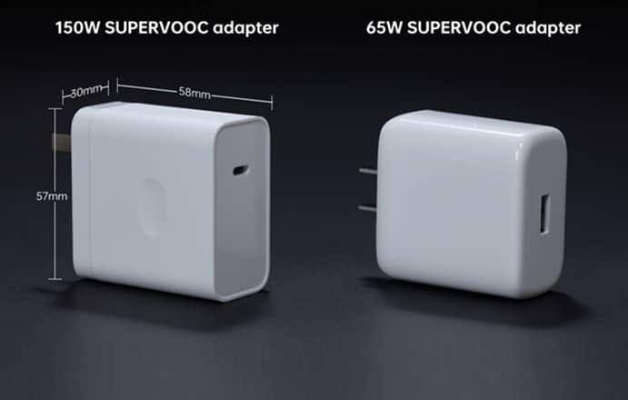 นอกจากนี้ อะแดปเตอร์สำหรับ 150W SUPERVOOC พร้อม BHE ยังมีการใช้แกลเลียมไนไตรด์ (GaN) เพื่อลดขนาดของอะแดปเตอร์ให้มีขนาดเกือบเท่ากับขนาดอะแดปเตอร์ 65W SUPERVOOC รุ่นก่อนหน้า โดยมีขนาด 58 x 57 x 30 มม. และน้ำหนักประมาณ 172 กรัม