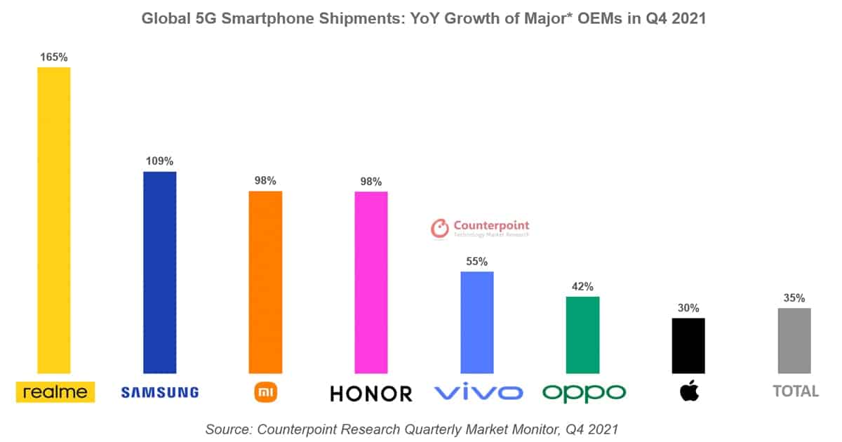 จากข้อมูลการสำรวจตลาดล่าสุดของ Counterpoint Research พบว่า realme ส่งท้ายปี 2021 ด้วยการเป็นแบรนด์ที่มีการจัดส่งสมาร์ทโฟน 5G ที่เติบโตเร็วที่สุด (สำหรับไตรมาสสิ้นสุดเดือนธันวาคม)
