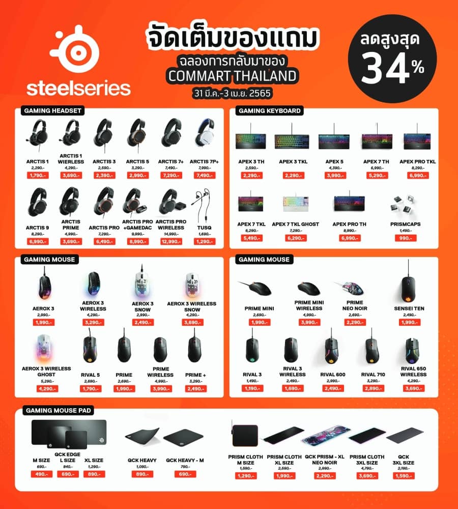 ภายในงานจะได้พบกับอุปกรณ์เกมมิ่งจากแบรนด์ SteelSeries อาทิ หูฟัง, เมาส์, คีย์บอร์ด แผ่นรองเมาส์ ฯลฯ ที่ยกขบวนมาลดแลกแจกแถมอย่างเต็มที่ ด้วยส่วนลดสูงสุด 34% สำหรับลูกค้าซื้อสินค้า SteelSeries ภายใต้เงื่อนไขที่กำหนดของแคมเปญ “ซื้อครบ…รับฟรี” จะได้รับของสมนาคุณดังต่อไปนี้