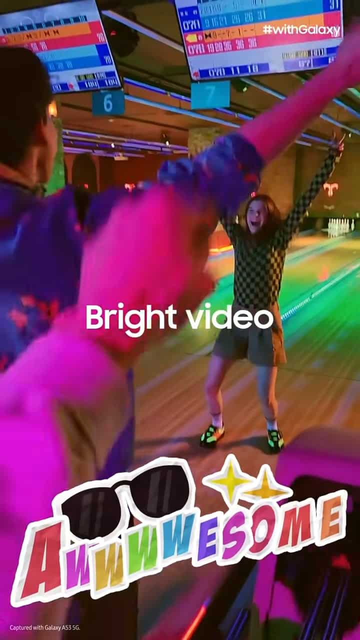 คุ้มค่ายืนหนึ่งไม่เกินจริงเพราะ Galaxy A53 5G ใส่นวัตกรรมกล้องระดับแฟลกชิปมาให้ด้วย! กับ Night Mode ที่มาพร้อมเทคโนโลยี Multi-frame processing รวม 20 เฟรมเป็น 1 ภาพ ช่วยลด Noise และความเบลอ ได้ภาพสวยคมครบทุกรายละเอียดแม้ถ่ายในที่แสงน้อย หรือถ้าไปโยนโบว์ลิ่งกับเพื่อนแล้วอยากถ่ายวิดีโอเก็บไว้เป็นความทรงจำก็ยังมีฟีเจอร์ Bright video ที่มี Auto frame rate ทำให้ได้วิดีโอคมชัดลื่นไหลไม่กระตุก ย้อนกลับมาดูกี่ครั้งก็ยังประทับใจ