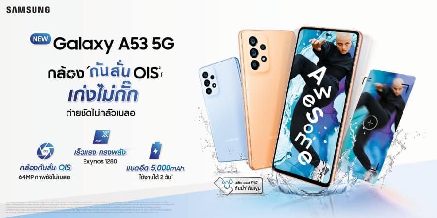 จัดเลย! เป็นเจ้าของสมาร์ทโฟนกล้องเก่งไม่กั๊ก Galaxy A53 5G ได้แล้ววันนี้ในราคา 14,499 บาท พร้อมตัวเลือก 3 สีสุด Awesome อย่าง สีส้มพีช Awesome Peach สีฟ้า Awesome Blue และสีดำ Awesome Black ที่ samsung.com, Samsung Experience Store และร้านค้าที่ร่วมรายการ ดูรายละเอียดเพิ่มเติมได้ทาง https://www.samsung.com/th/smartphones/galaxy-a/galaxy-a53-5g-awesome-peach-128gb-sm-a536ezogthl