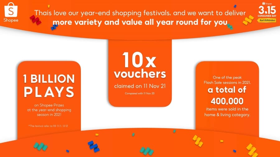 ปัจจุบันนี้ผู้คนหันมาช้อปออนไลน์มากขึ้นและเทศกาลช้อปปิ้งปลายปีได้รับความนิยมมาก เราจึงได้เปิดตัว Shopee 3.15 Consumer Day เพื่อสร้างสีสันแบบเดียวกันในช่วงต้นปี เรารู้สึกตื่นเต้นที่ได้เปิดตัว Shopee 3.15 Consumer Day เป็นครั้งแรกและหวังว่าแคมเปญนี้จะสร้างความสุขให้กับทุกคน”