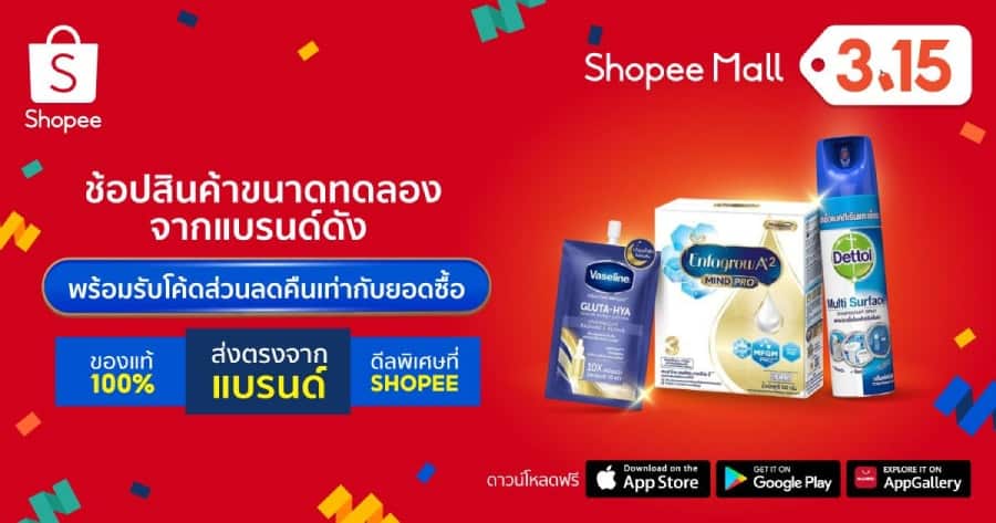 - มอบทางเลือกให้คุณกับการช้อปสินค้าขนาดทดลองจากแบรนด์โปรดได้โดยตรง : เปิดเคาน์เตอร์พิเศษในรูปแบบออนไลน์ให้ผู้ใช้งานได้มีโอกาสทดลองใช้ผลิตภัณฑ์ขนาดตัวอย่างจาก แบรนด์ชั้นนำมากมาย ในหมวดหมู่สินค้ายอดนิยม เช่น หมวดหมู่ของใช้ในบ้านและของใช้จำเป็น หมวดหมู่สุขภาพและความงาม และหมวดหมู่ของใช้สำหรับเด็ก ใน Shopee Mall และ Shopee Premium โดยสามารถช้อปสินค้าขนาดทดลองได้ตั้งแต่วันที่ 1-7 มีนาคม 2565 พร้อมการรับประกันคืนเงิน 100% ในรูปแบบ Voucher จากแบรนด์ที่มีมูลค่าเทียบเท่ากับราคาที่จ่ายไปสำหรับผลิตภัณฑ์ขนาดตัวอย่าง เพื่อชดเชยในการซื้อครั้งต่อไป
