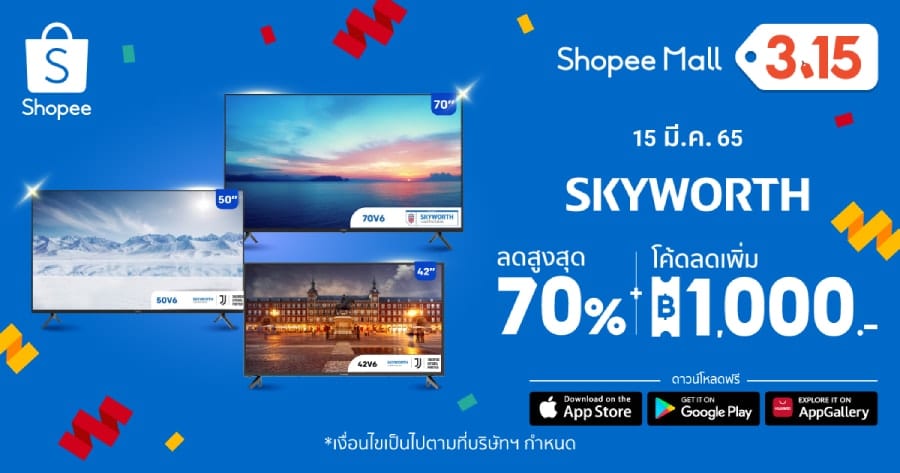 - พิเศษ! เฉพาะวันที่ 15 วันเดียวเท่านั้น ช้อปบน Shopee Mall รับโค้ดลดเพิ่มจาก Skyworth สูงสุดถึง 1,000 บาท