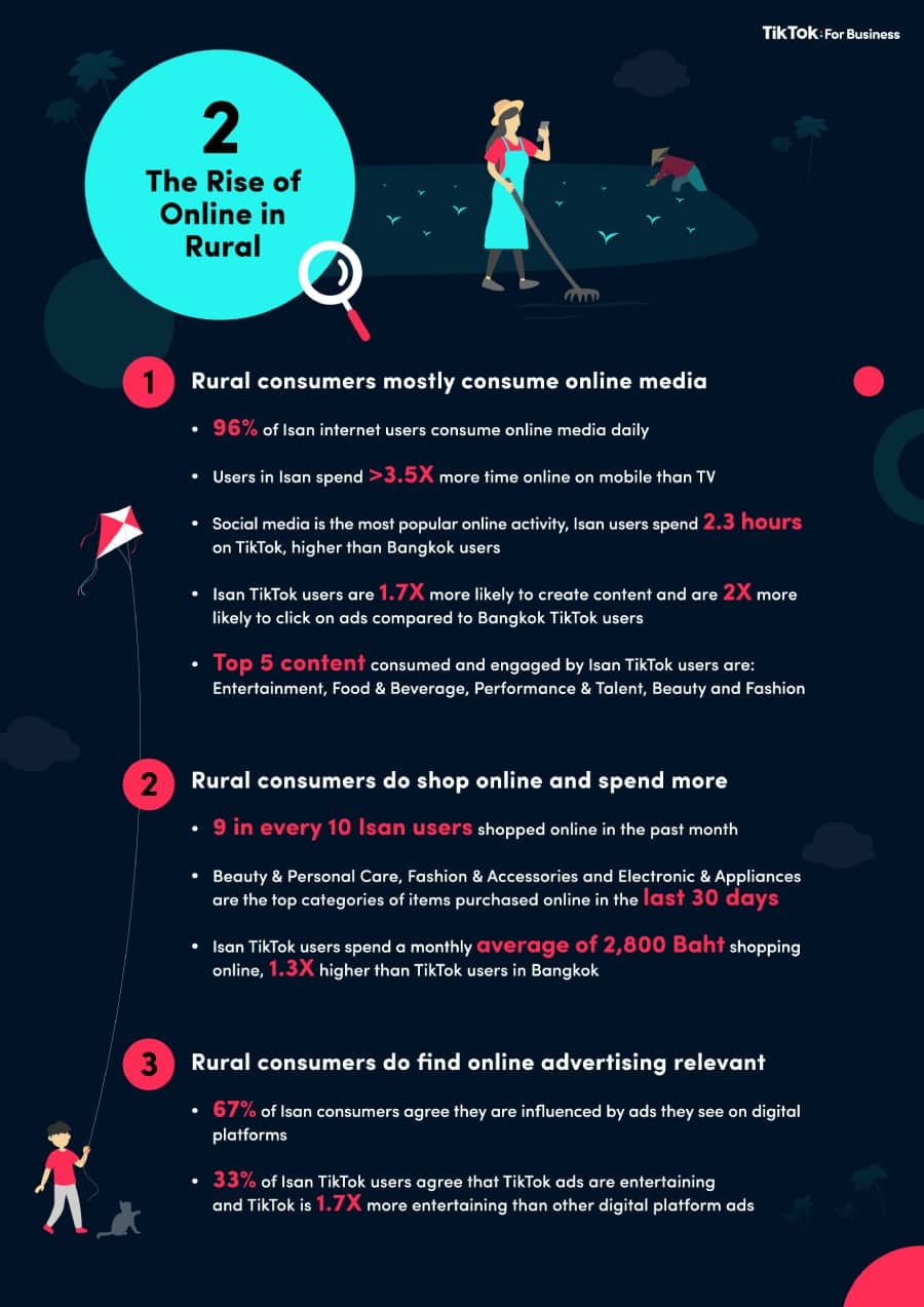 ปัจจุบันผู้บริโภคชาวภาคตะวันออกเฉียงเหนือมีความกระตือรือร้นและต้องการมีส่วนร่วมกับแพลตฟอร์มดิจิทัล โดย TikTok เป็นหนึ่งใน 3 แพลตฟอร์มชั้นนำที่พวกเขาใช้ ซึ่งมากกว่า 72% ของผู้บริโภคชาวภาคตะวันออกเฉียงเหนือใช้ TikTok ในช่วง 30 วันที่ผ่านมา นอกจากนี้ 67% ของผู้บริโภคภาคตะวันออกเฉียงเหนือยอมรับว่าพวกเขาได้รับอิทธิพลจากโฆษณาที่พวกเขาเห็นบนแพลตฟอร์มดิจิทัล