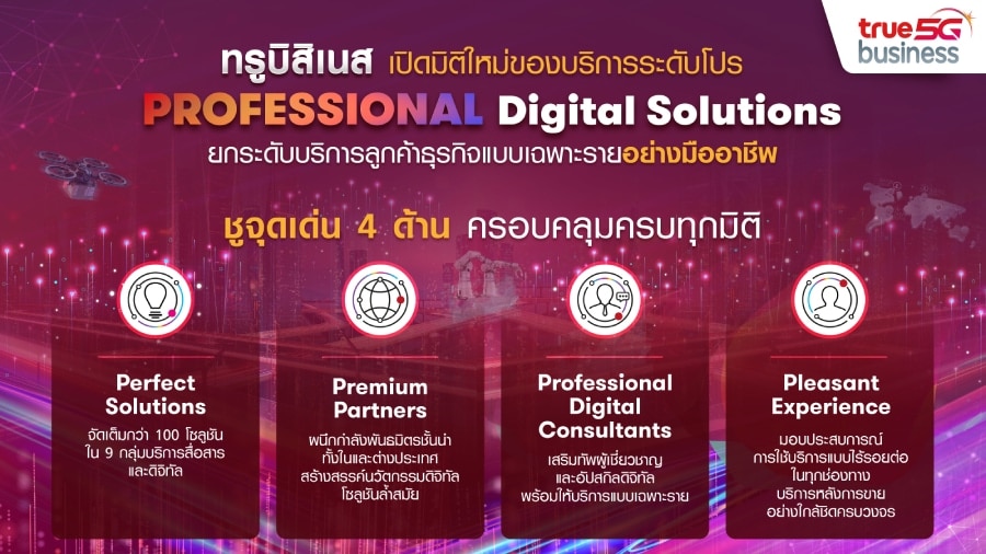 โดย ทรูบิสิเนส ผู้นำบริการสื่อสารและดิจิทัลโซลูชันครบวงจร ได้ก้าวไปอีกขั้นสู่มิติใหม่ของบริการระดับโปรสำหรับองค์กรและธุรกิจในยุคดิจิทัล ด้วยยุทธศาสตร์ Professional Digital Solutions ที่มุ่งยกระดับบริการดิจิทัลสำหรับลูกค้าธุรกิจแบบเฉพาะรายอย่างมืออาชีพ โดยใช้กลยุทธ์ 4 ด้านที่ครอบคลุมทุกความต้องการอย่างเหนือชั้น ประกอบด้วย Perfect Solutions การพัฒนาและสรรหาโซลูชันที่หลากหลายรองรับทุกรูปแบบการใช้งานของธุรกิจ Premium Partners ความร่วมมือกับพันธมิตรชั้นนำเพื่อพัฒนานวัตกรรมและสร้างระบบนิเวศดิจิทัลเพื่อองค์กรธุรกิจ รวมถึง Professional Digital Consultants การเพิ่มศักยภาพบุคลากรผู้เชี่ยวชาญที่มีความรู้และความชำนาญ เพื่อให้บริการลูกค้าอย่างมืออาชีพ และ Pleasant Experience บริการหลังการขายในหลากหลายช่องทางที่เชื่อมโยงแบบไร้รอยต่อ เพื่อมอบประสบการณ์การใช้บริการที่ดีที่สุดตลอดระยะเวลาการใช้บริการของทรูบิสิเนส