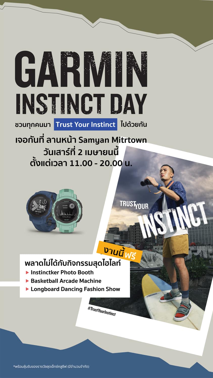 ที่จะสร้างประสบการณ์อันน่าตื่นเต้นให้กับผู้เข้าร่วมงาน เหล่ายังเจนฯ ยังได้มีโอกาสร่วมสัมผัสเรื่องราว TRUST YOUR INSTINCT ในหลากหลายรูปแบบ รวมถึงกิจกรรมร่วมสนุกเพื่อลุ้นรับสมาร์ทวอทช์ INSTINCT 2 ซีรีย์ จำนวน 6 เรือนและของรางวัลอื่นๆ อีกมากมาย มูลค่ารวมกว่า 100,000 บาท ทั้งภายในงานและช่องทางออนไลน์ นอกจากนี้ยังมีการเผยโฉม INSTINCT 2 ซีรีย์หลากหลายสไตล์ในสภาวะการใช้งานที่แตกต่างกัน ถ่ายทอดความโดดเด่นตามแบบฉบับ BOLD & RUGGED แข็งแกร่ง และทนทานให้ผู้เข้าร่วมงานได้เห็นเป็นครั้งแรก! โดยกิจกรรมจะจัดขึ้นในวันที่ 2 เมษายน 2565 ตั้งแต่เวลา 11.00 น. – 20.00 น. ณ ชั้น G โซนเอ้าท์ดอร์ ศูนย์การค้าสามย่านมิตรทาวน์สำหรับผู้ที่สนใจสามารถติดตามรายละเอียดเพิ่มเติมได้ที่เฟสบุ๊กแฟนเพจ Garmin Thailand