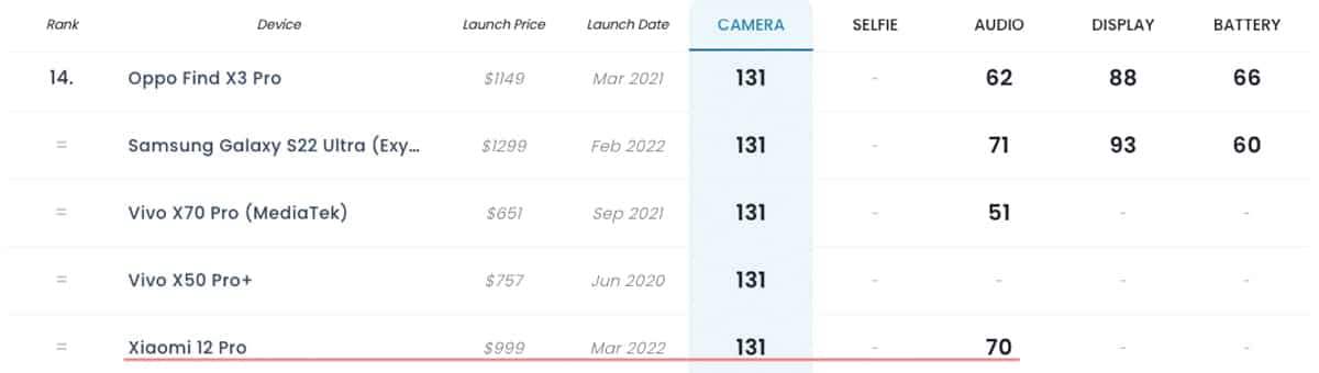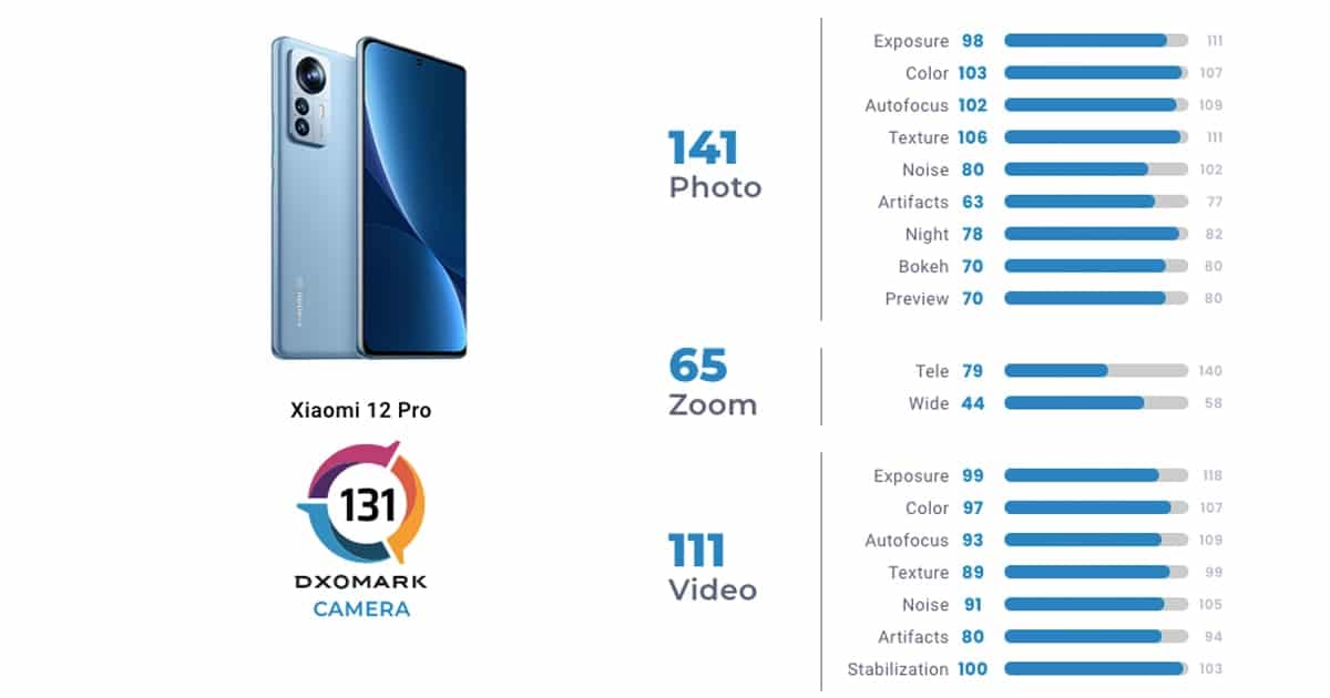 Xiaomi 12 Pro ได้คะแนนรวม 131 คะแนนโดยแบ่งเป็น คะแนนภาพนิ่ง 141 คะแนน คะแนนการซูม 65 คะแนน และคะแนนวิดีโอ 111 คะแนน