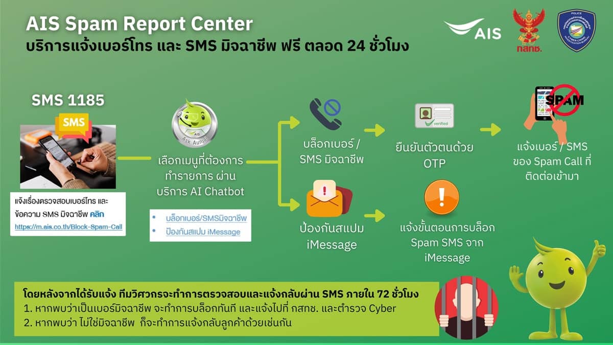 AIS Spam Report Center สายด่วน 1185 ศูนย์รับเรื่องร้องเรียนเบอร์โทรและ SMS มิจฉาชีพ แก็งคอลเซ็นเตอร์