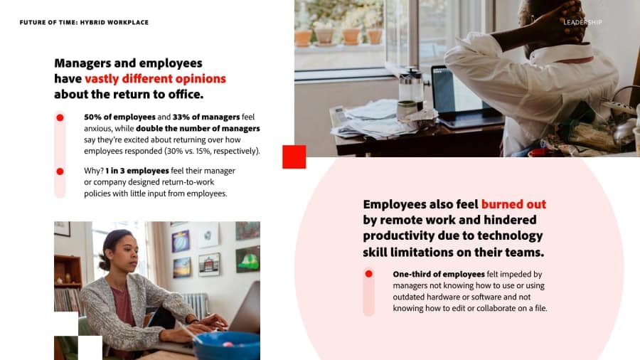 ขณะที่หลาย ๆ บริษัทเริ่มออกนโยบายการกลับเข้าทำงานในออฟฟิศ พบว่าผู้จัดการและพนักงานมีความเห็นที่แตกต่างกันเกี่ยวกับพัฒนาการล่าสุด และเมื่อตรวจสอบลึกลงไป เราพบว่า “เทคโนโลยี” เป็นปัจจัยที่ช่วยอธิบายความเห็นที่แตกต่างกันของผู้จัดการและทีมงาน กล่าวคือ พนักงาน 1 ใน 3 รู้สึกว่าตนเองไม่สามารถทำงานได้อย่างเต็มที่ เพราะผู้จัดการใช้เทคโนโลยีที่ล้าสมัยหรือมีปัญหาในการใช้เครื่องมือที่ทันสมัยในการทำงานร่วมกัน และมีเพียง 1 ใน 2 เท่านั้นที่รู้สึกว่าผู้จัดการของตนเองมีความชำนาญในเรื่องเทคโนโลยีในระดับหนึ่ง ที่จริงแล้วพนักงานจำนวนมากระบุว่าระบบที่ไร้ประสิทธิภาพในแง่ของเทคโนโลยีส่งผลให้พนักงานต้องใช้เวลามากขึ้นในการทำงาน ขณะที่ประสิทธิภาพการทำงานลดน้อยลง
