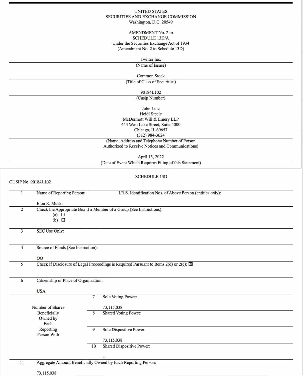 ส่วนในจดหมายถึงคณะกรรมการกำกับหลักทรัพย์และตลาดหลักทรัพย์ของสหรัฐ หรือ SEC นั้น Musk กล่าวว่า หลังจากที่เขาซื้อหุ้นของ Twitter 9.1% เมื่อต้นเดือนที่ผ่านมาแล้ว เขากำลังยื่นข้อเสนอเพื่อซื้อหุ้น Twitter ทั้งหมด 100% ด้วยเงินสดในราคา 54.20 ดอลลาร์ต่อหุ้น
