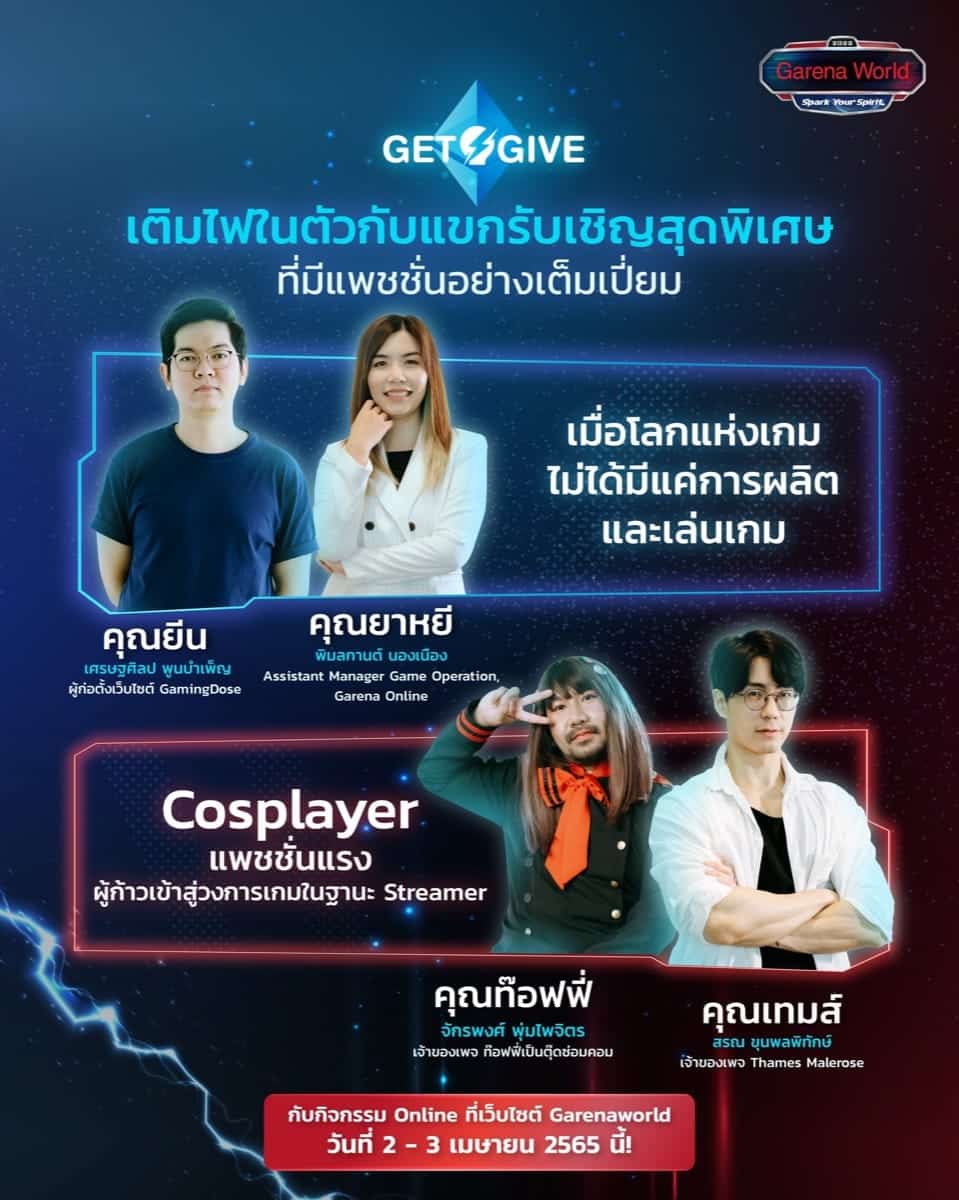 นอกจากนี้ ภายในงาน Garena World 2022 ยังจัดโซน “Garena Get & Give” ที่จะพาทุกคนไปส่องโลกอาชีพเกมและอีสปอร์ตและรับแรงบันดาลใจดี ๆ ผ่านการพูดคุยกับบุคคลในวงการเกมและอีสปอร์ต ที่ได้มาแชร์มุมมองและประสบการณ์ที่หลากหลาย ทั้งในแง่ของการทำงานและการเลือก ‘ทำ’ และ ‘เป็น’ ในสิ่งที่ตัวเองชื่นชอบ