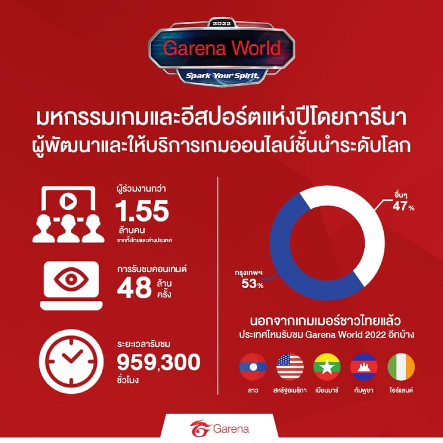ความสำเร็จจากงานGarena World 2022 นอกจากจะชี้ให้เห็นถึงศักยภาพของอุตสาหกรรมเกมและอีสปอร์ต ก็ยังทำให้เราได้เห็นภาพการรวมพลังบวกในคอมมูนิตี้เกมและอีสปอร์ตที่เราตั้งใจผลักดันให้เป็นพื้นที่ที่เปิดโอกาสให้ทุกคนได้เข้ามามีส่วนร่วม ทั้งในการร่วมสนุกกับเกมและอีสปอร์ตที่เป็นความสนใจร่วมกันของพวกเขา รวมถึงการส่งต่อพลังดี ๆ เพื่อสร้าง Social Impact ที่ดี ในด้านต่าง ๆ ที่พวกเขาให้ความสนใจ”