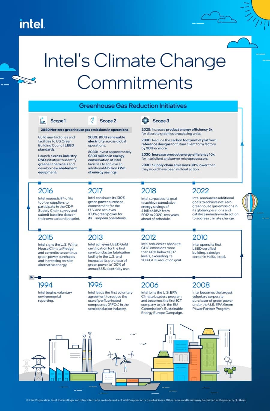 อินเทล คอร์ปอเรชัน ได้ประกาศแผนการที่จะลดการปล่อย ก๊าซเรือนกระจก ทั้งทางตรงและทางอ้อม พร้อมเดินหน้าพัฒนาโซลูชันเทคโนโลยีที่ยั่งยืนมากขึ้น โดยบริษัทฯ ได้ให้คำมั่นที่จะบรรลุการปล่อยก๊าซเรือนกระจก (greenhouse gas) สุทธิเป็นศูนย์ในการดำเนินงานทั่วโลกภายในปี 2583 เพื่อเพิ่มประสิทธิภาพการใช้พลังงานและลดการปล่อยก๊าซคาร์บอนไดออกไซด์ของผลิตภัณฑ์และแพลตฟอร์มต่างๆ ของอินเทล โดยมีเป้าหมายที่จำเพาะและชัดเจน และเพื่อทำงานร่วมกับลูกค้าและคู่ค้าในอุตสาหกรรมเพื่อสร้างโซลูชันที่จะช่วยลดค่ารอยเท้าก๊าซเรือนกระจก (greenhouse gas footprint) ของระบบนิเวศทางเทคโนโลยีทั้งหมด