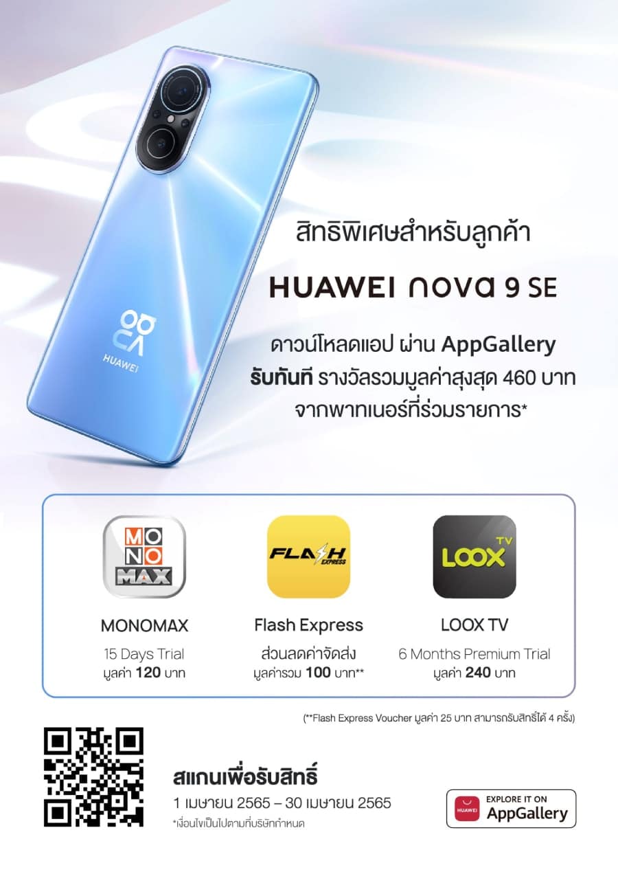 โดนใจคนใช้งานแอปฯ เป็นที่สุดเพราะหัวเว่ยได้จัดกิจกรรมพิเศษสำหรับลูกค้าที่ใช้ HUAWEI nova 9 SE เมื่อโหลดแอปฯ MONOMAX, FLASH Express, และ LOOX TV ผ่าน AppGallery ตั้งแต่วันที่ 1 เมษายน 2565 ถึง 30 เมษายน 2565 รับไปเลยทันที สิทธิพิเศษเป็นคูปองเพื่อการใช้งานรวมมูลค่าสูงสุดถึง 460 บาท ให้ใช้กันฟรีๆ ตามเงื่อนไขที่ทางหัวเว่ยกำหนด (สแกน QR Code บนภาพเพื่อดูรายละเอียดเพิ่มเติม สามารถลงทะเบียนรับของรางวัลสุดพิเศษได้ที่ลิ้งก์นี้)