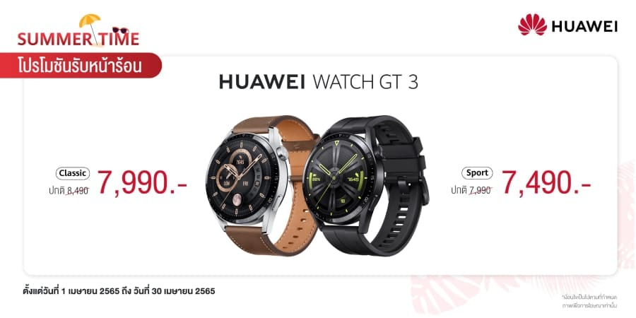 ลดราคาเหลือเพียง 9,490 บาท จากราคาปกติ 9,990 บาท กับ HUAWEI WATCH GT 3 รุ่น 46 มม. Classic Edition สายสีน้ำตาลเรียบหรูเหมาะกับใส่ในชีวิตประจำวัน ลดราคาเหลือเพียง 7,990 บาท จากราคาปกติ 8,490 บาท และรุ่น 46 มม. Sport Edition สำหรับสายสปอร์ตสายฟิต ลดราคาเหลือเพียง 7,490 บาท จากราคาปกติ 7,990 บาท