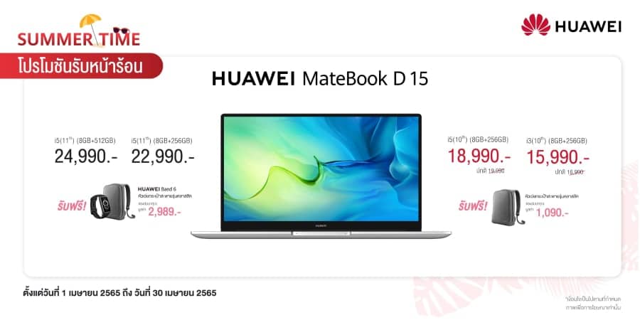 - MateBook D 15 New รุ่น i5 10th Gen 8GB+256GB ลดราคาเหลือเพียง 18,990 บาท จากราคาปกติ 19,990 บาท