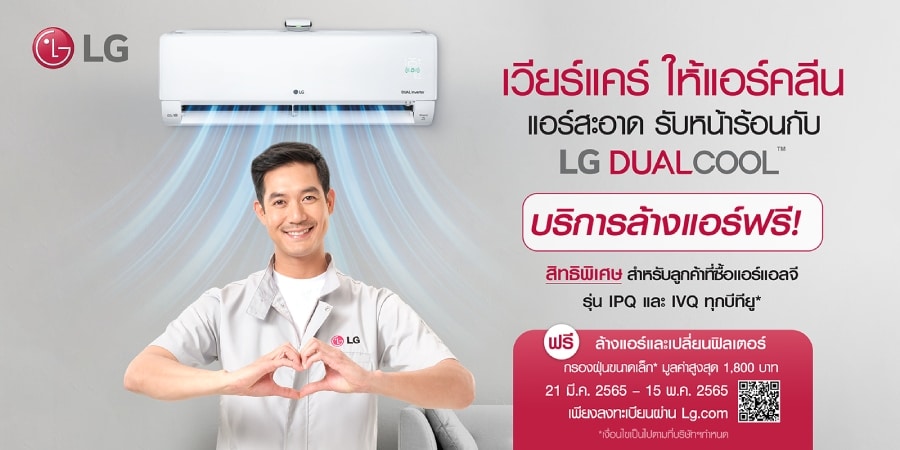 ในฤดูร้อนที่อุณหภูมิกำลังเพิ่มสูงขึ้นอย่างต่อเนื่อง บริษัท แอลจี อีเลคทรอนิคส์ (ประเทศไทย) จำกัด มุ่งคลายร้อนให้แก่ผู้บริโภคชาวไทยทุกคนด้วยนวัตกรรม เครื่องปรับอากาศ ภายในบ้านกับโปรโมชั่นสุดคุ้ม “Wiery Happy Wiery Cool” เมื่อซื้อเครื่องปรับอากาศภายในบ้านแอลจีจากไลน์อัพใหม่ล่าสุดรุ่นใดก็ได้ที่มีขนาดตั้งแต่ 12,000 บีทียูขึ้นไป สามารถผ่อนชำระด้วยอัตรา ผ่อน 0% นานสูงสุด 10 เดือน เมื่อชำระเงินด้วยบัตรเครดิตที่ร่วมรายการ พร้อมต้อนรับหน้าร้อนปีนี้ด้วยสิทธิพิเศษ “เวียร์แคร์ ให้แอร์คลีน” สำหรับลูกค้าที่ซื้อเครื่องปรับอากาศภายในบ้านแอลจีรุ่น ดูอัล คูล เพียวริ (DUALCOOL Puri หรือรุ่น IPQ) พร้อมรับฟรี! บริการล้างเครื่องปรับอากาศภายในบ้านจำนวน 1 ครั้ง พร้อมแผ่นฟิลเตอร์กรองฝุ่นละอองที่มีอนุภาคขนาดเล็กถึง 1.0 ไมครอน (PM1.0) มูลค่ารวมกว่า 1,800 บาท และสำหรับเครื่องปรับอากาศรุ่นดูอัล คูล ยูวี (DUALCOOL UV หรือรุ่น IVQ) ทุกขนาดบีทียู รับฟรี! แผ่นฟิลเตอร์กรองฝุ่นละอองที่มีอนุภาคขนาดเล็ก 2.5 ไมครอน (PM2.5) มูลค่ารวมกว่า 1,300 บาท ตั้งแต่วันนี้จนถึงวันที่ 15 พฤษภาคม พ.ศ. 2565