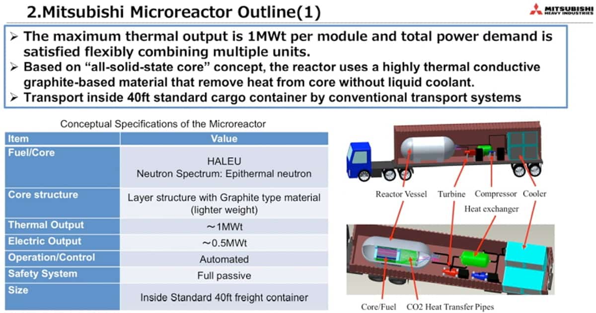 บริษัท Mitsubishi Heavy Industries จากญี่ปุ่น วางแผนจะพัฒนาและผลิต Microreactor เครื่องปฏิกรณ์นิวเคลียร์ขนาดเล็กเชิงพาณิชย์ ที่สามารถจัดส่งผ่านทางรถบรรทุกได้ ภายในสิ้นทศวรรษหน้า โดยหวังว่าโครงการนี้จะสามารถผลิตพลังงานจำนวนมากได้โดยไม่มีการปล่อยคาร์บอนออกมา