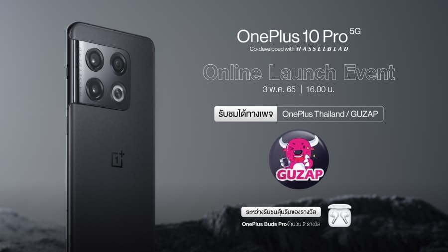 สำหรับแฟน ๆ ประเทศไทย เตรียมรับชมงานเปิดตัวในรูปแบบออนไลน์ของสมาร์ทโฟนรุ่นใหม่ OnePlus 10 Pro 5G Online Launch Event พร้อมกัน ในวันอังคาร ที่ 3 พฤษภาคม 2565 เวลา 16.00 น. ตามเวลาในประเทศไทย รอลุ้นราคาการวางจำหน่าย พร้อมโปรโมชั่นต่าง ๆ ผ่านการชมไลฟ์ได้ 2 ช่องทางที่ Facebook page : OnePlus Thailand และ สื่อไอทีเพจ GUZAP พร้อม Special Guest คุณเบียร์ จากเพจ ช่างภาพชื่อดังฐานะร่ำรวย ที่มาร่วมแชร์ประสบการณ์และความประทับใจจากการใช้งานจริง และระหว่างรับชมลุ้นรับของรางวัล OnePlus Buds Pro จำนวน 2 รางวัล ร่วมลุ้นเป็นผู้โชคดีและสัมผัสประสบการณ์สมาร์ทโฟนเรือธงที่ครบครันที่สุดของเราไปด้วยกัน