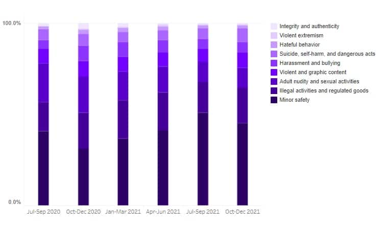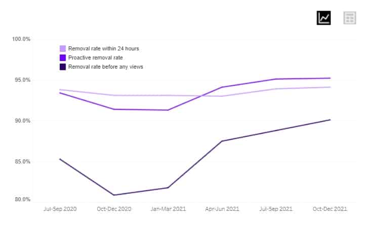 - ในจำนวนนั้น 95.2% ถูกลบออกก่อนมีการรายงานซึ่งนับเป็นการตรวจจับเชิงรุก และอีก 90.1% ถูกลบออกก่อนที่จะมีการดู และอีก 94.1% ถูกลบภายใน 24 ชั่วโมงหลังจากการโพสต์