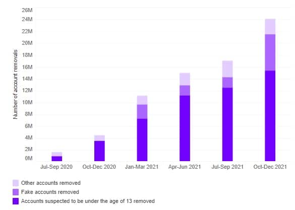 นอกเหนือจากการลบบัญชีที่ละเมิดหลักเกณฑ์สำหรับชุมชนและข้อกำหนดในการให้บริการแล้ว ด้วยนโยบายที่เข้มงวดในการปกป้องผู้เยาว์ TikTok ลบบัญชีที่สงสัยว่ามีอายุต่ำกว่า 13 ปี ออกถึง 15 ล้านบัญชี รวมถึงบัญชีปลอม (Fake Account) อีกกว่า 6 ล้านบัญชีอีกด้วย ซึ่งวิดีโอที่ถูกโพสต์โดยบัญชีเหล่านั้นได้ถูกลบออกเช่นกัน นับเป็นมาตรการเชิงรุกเพื่อป้องกันไม่ให้มีการสร้างบัญชีสแปมผ่านวิธีการอัตโนมัติ