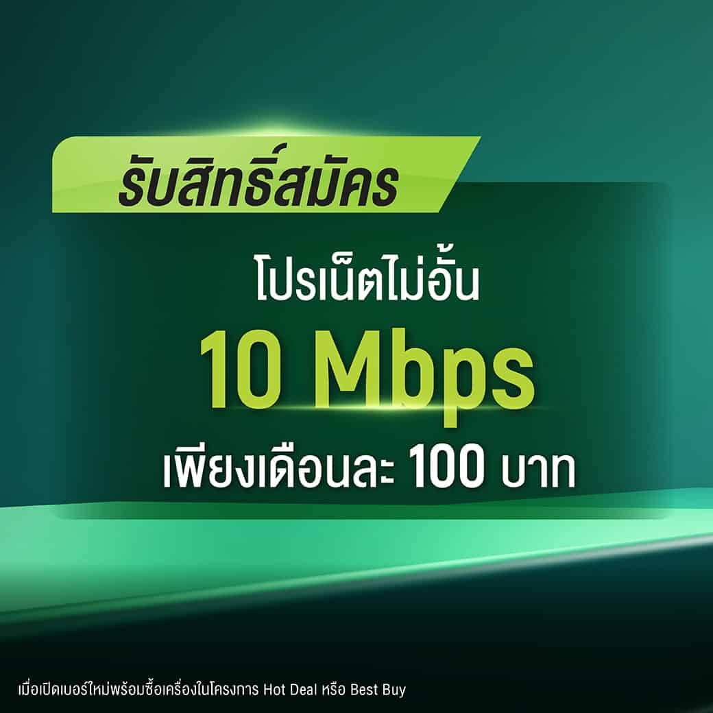 • รับสิทธิ์เปิดเบอร์ใหม่พร้อมโปรเน็ตไม่อั้น 10 Mbps เพียงเดือนละ 100 บาท เมื่อซื้อเครื่องในโครงการ Hot Deal หรือ Best Buy