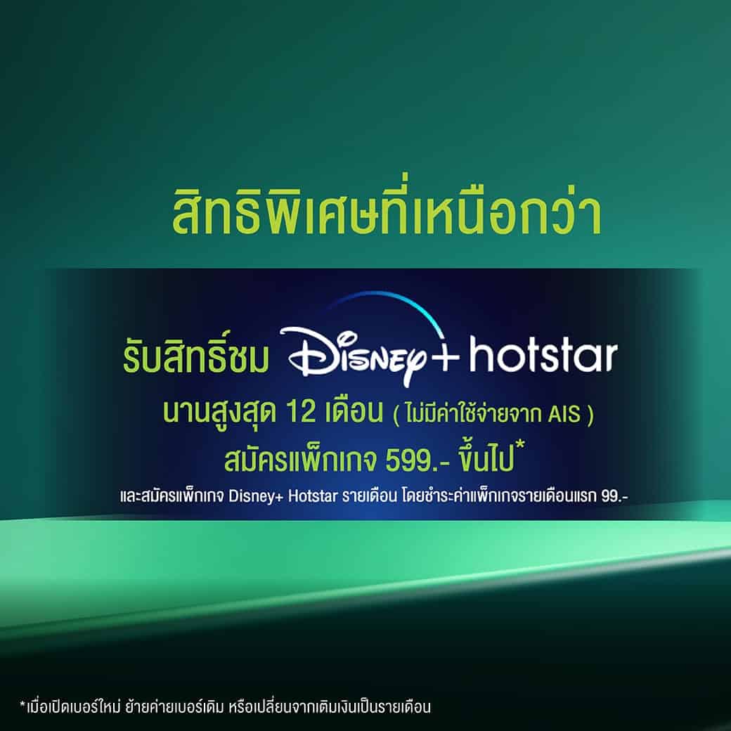 • รับสิทธิ์ชม Disney+ Hotstar นานสูงสุด 12 เดือน (ไม่มีค่าใช้จ่ายจาก AIS) เมื่อสมัครแพ็กเกจ 599 บาท ขึ้นไป และสมัครแพ็กเกจ Disney+ Hotstar รายเดือน โดยชำระค่าแพ็กเกจรายเดือนแรก 99 บาท สำหรับลูกค้าเปิดเบอร์ใหม่ ย้ายค่ายเบอร์เดิม หรือเปลี่ยนเติมเงินเป็นรายเดือน