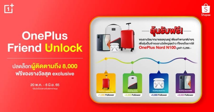 ช้อปส่งท้ายเดือนพฤษภาคมนี้กับ Shopee Smartphone Expo X OnePlus และ Lazada Payday พร้อมเตรียมต้อนรับ OnePlus Mid Year Sale 6.6 รับชมไลฟ์ วันที่ 5-6 มิถุนายน พบกับสมาร์ทโฟนราคาพิเศษ และรับของแถมสุด exclusive ในไลฟ์ พิเศษกับแคมเปญ OnePlus Friend Unlock ร่วมกันปลดล็อค 8,000 ผู้ติดตาม บนร้านค้า OnePlus Official Store บน Shopee รับของรางวัลใหญ่สุด OnePlus Nord N100 มูลค่า 5,299.-