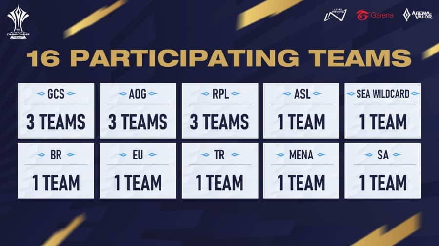 ครั้งนี้จะมีทีมเข้าร่วมเพิ่มขึ้นจากภูมิภาคอื่น ๆ จากทั่วโลก เหล่าแฟน ๆ ของ RoV จะได้เพลิดเพลินกับประสบการณ์การรับชมที่เหนือกว่า ด้วยทักษะสกิลเพลย์การต่อสู้ และกลยุทธ์ที่หลากหลายซึ่งนำมาสู่ผู้เข้าร่วม 16 ทีมจาก 10 ภูมิภาคทั่วโลก ทั้ง Garena Challenger Series (GCS), RoV Pro League (RPL), Arena of Glory (AOG), AOV Star League (ASL), SEA Wildcard (อินโดนีเซีย, มาเลเซีย, สิงคโปร์ และฟิลิปปินส์), บราซิล, ยุโรปตะวันตก, ตุรกี, ตะวันออกกลาง, แอฟริกาเหนือ และเอเชียใต้ ที่จะมารวมตัวกันในสนามการแข่งขัน AIC เสมือนจริงสำหรับการแข่งขันที่ยิ่งใหญ่ที่สุดแห่งปี